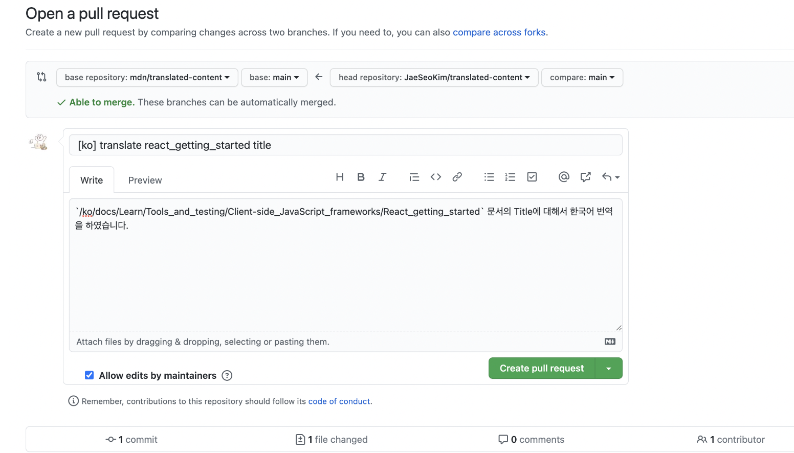 그리고 커밋을 한 뒤, git push [branch-name]를 하고, fork했었던 translated-content로 간다.