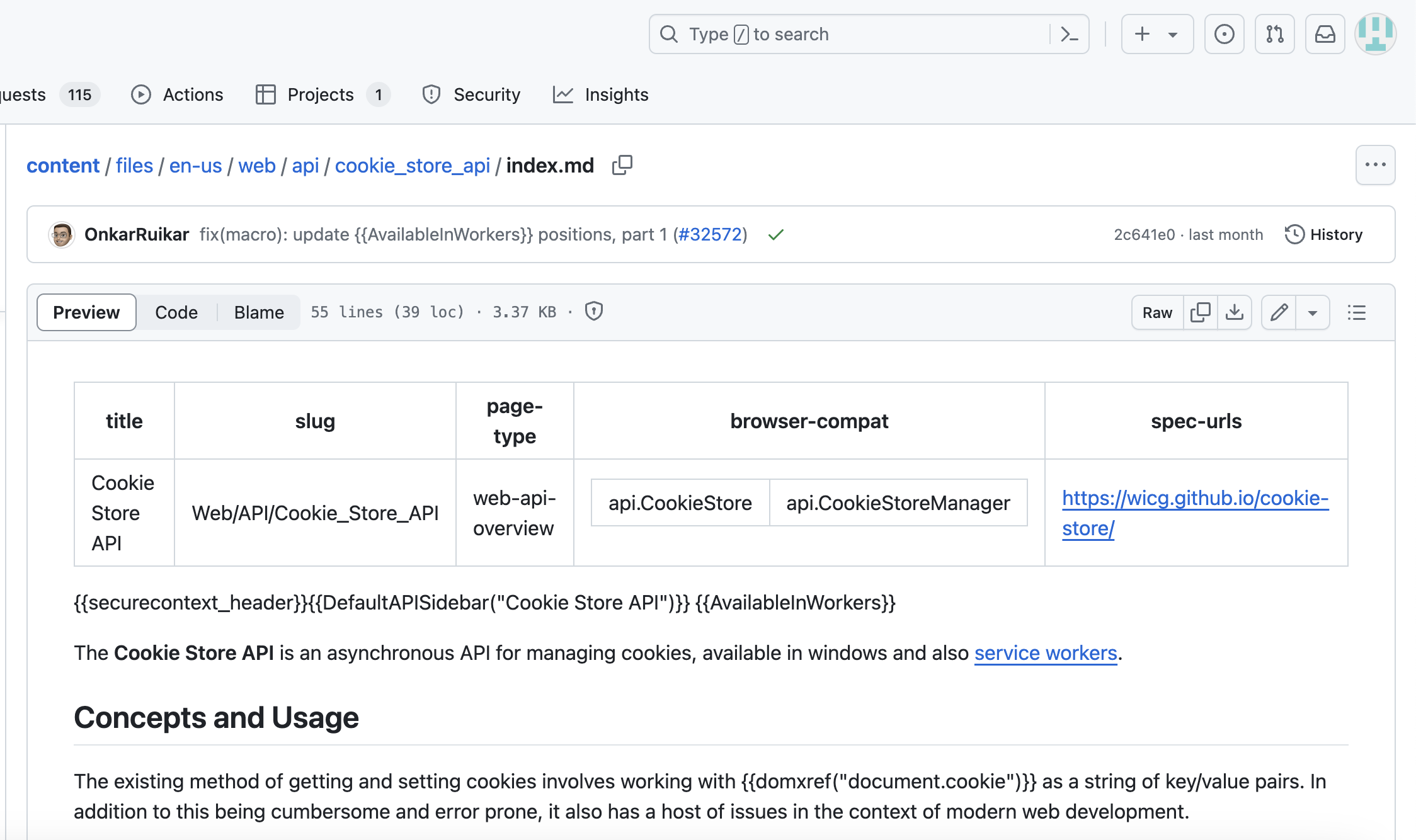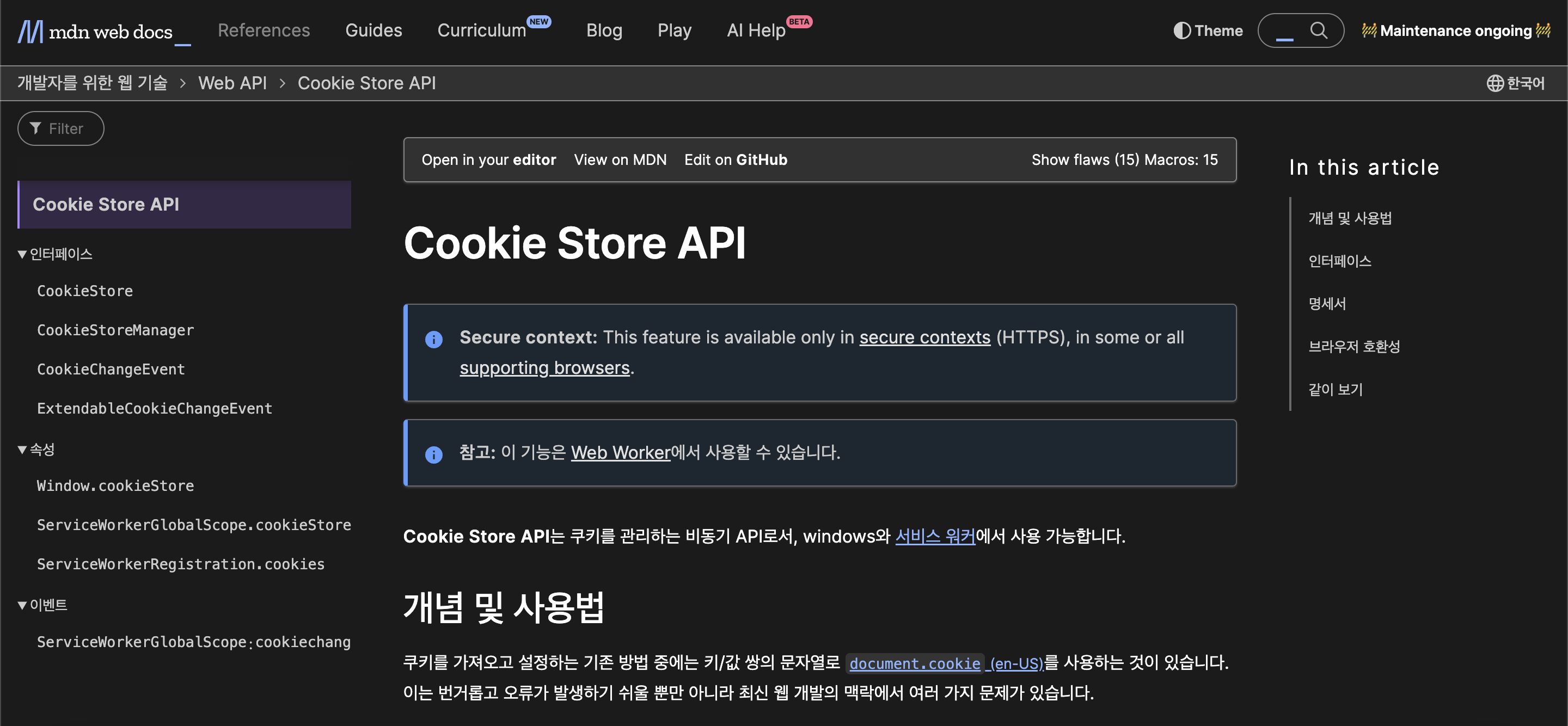 일단 영어 원문 깃헙 저장소로 간다. 그리고 내가 편집할 문서가 있는 곳까지 간다. (일단 내가 번역에 기여한 cookie store api를 예로 들겠다.)