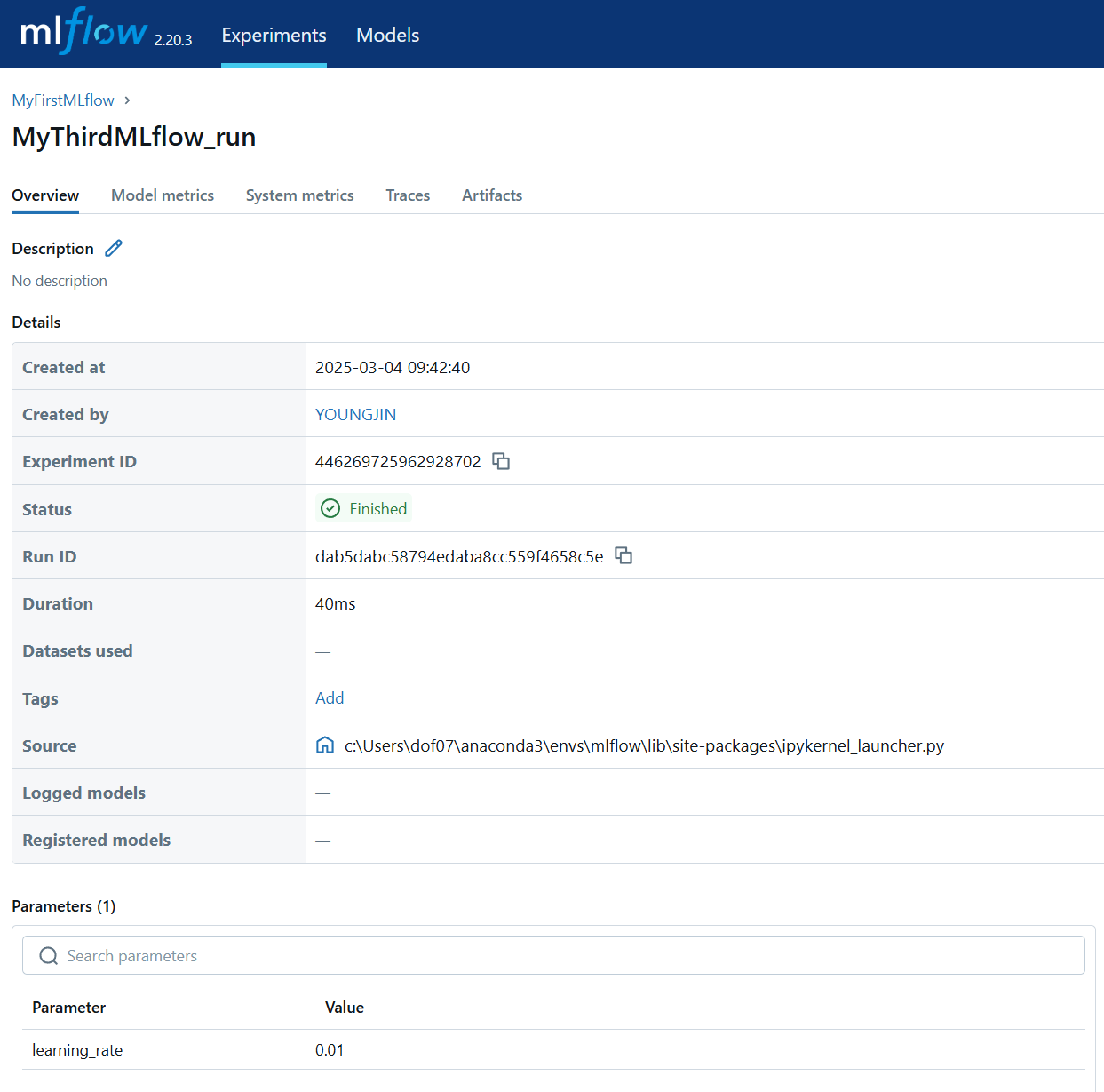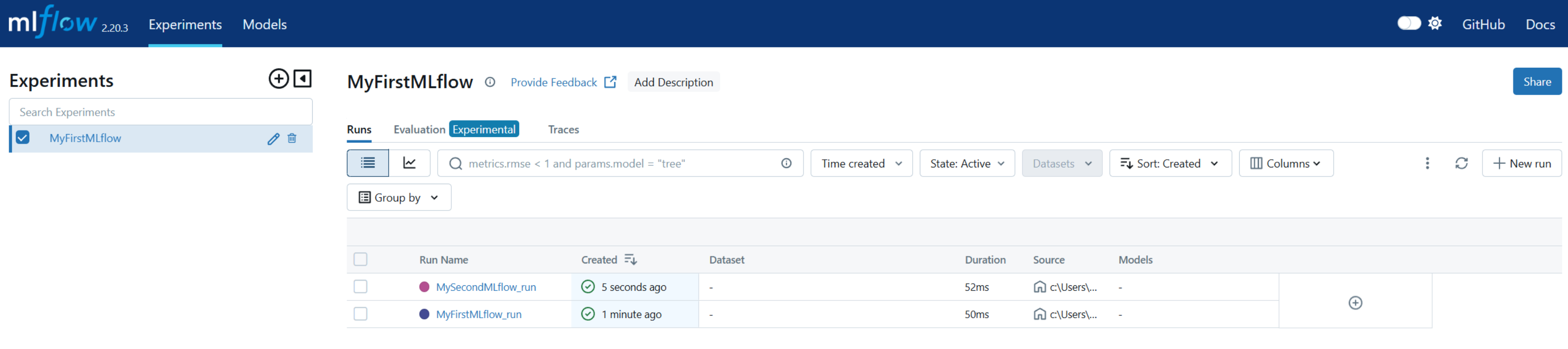 with mlflow.start_run(run_name="MyThirdMLflow_run", experiment_id = experiment.experiment_id) as run: