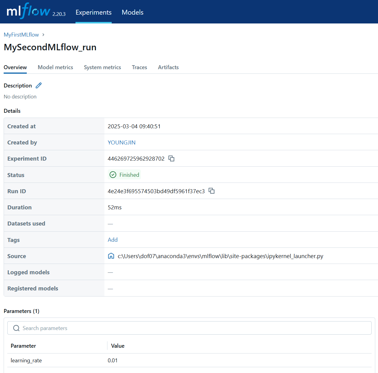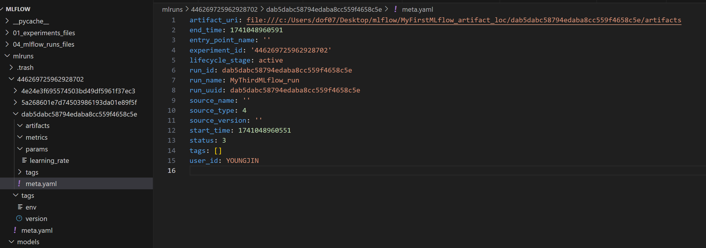 Run Info: <RunInfo: artifact_uri='file:///c:/Users/dof07/Desktop/mlflow/MyFirstMLflow_artifact_loc/4e24e3f695574503bd49df5961f37ec3/artifacts', end_time=None, experiment_id='446269725962928702', lifecycle_stage='active', run_id='4e24e3f695574503bd49df5961f37ec3', run_name='MySecondMLflow_run', run_uuid='4e24e3f695574503bd49df5961f37ec3', start_time=1741048851677, status='RUNNING', user_id='YOUNGJIN'>