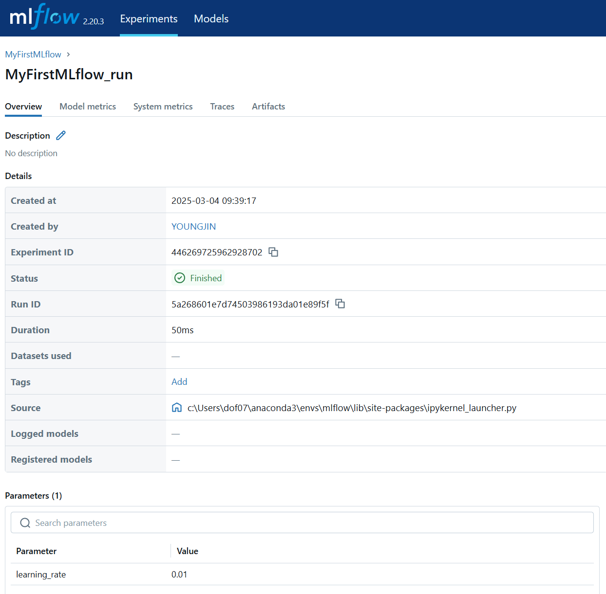 mlflow.start_run(run_name="MyFirstMLflow_run")