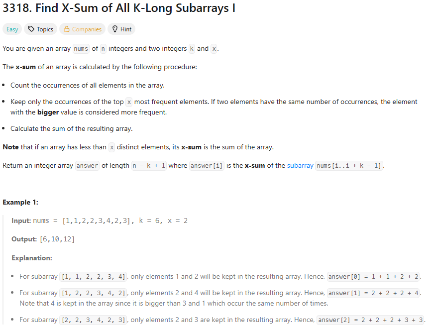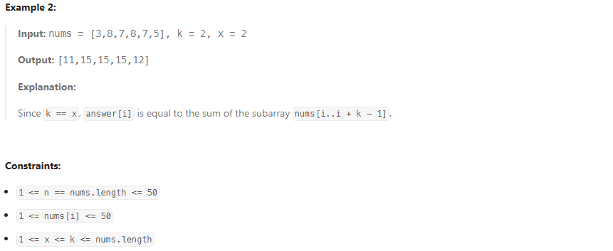 문제의 설명대로 길이 k의 부분수열에서 빈도수를 계산하고 자주 등장한 숫자들로 x_sum을 답에 넣었다.
