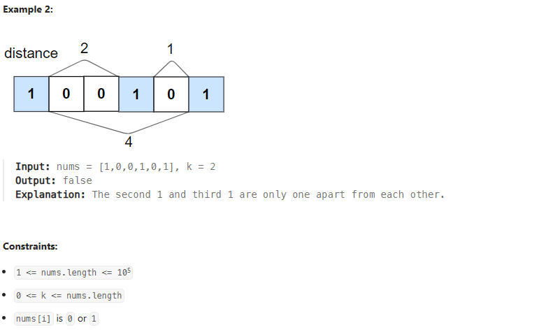 처음 보자마자 nums를 순회하여 0을 만날 때마다 distance를 올렸고 1을 만날 때 d가 k보다 작은 경우 True/False를 체크했다.