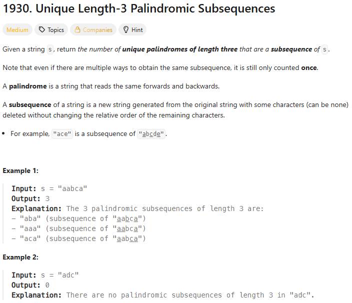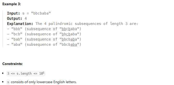 def countPalindromicSubsequence(self, s: str) -> int: