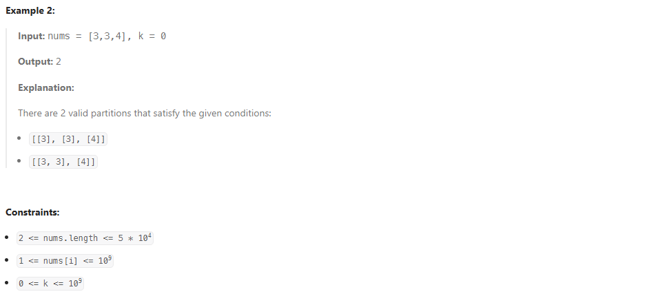 def countPartitions(self, nums: List[int], k: int) -> int: