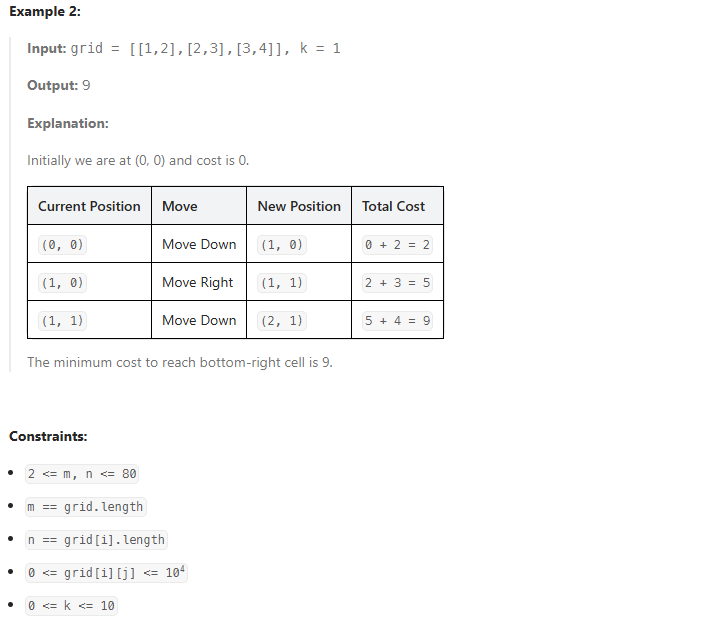 def minCost(self, grid: List[List[int]], k: int) -> int: # 격자에서 텔레포트를 최대 k번 고려한 최소 비용을 반환하는 함수