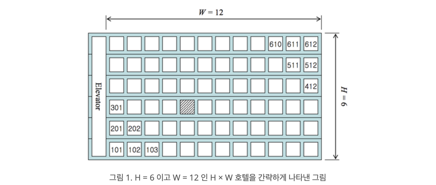 문제를 단순화하기 위해서 호텔은 직사각형 모양이라고 가정하자. 각 층에 W 개의 방이 있는 H 층 건물이라고 가정하자 (1 ≤ H, W ≤ 99). 그리고 엘리베이터는 가장 왼쪽에 있다고 가정하자(그림 1 참고). 이런 형태의 호텔을 H × W 형태 호텔이라고 부른다.