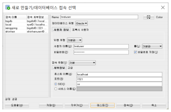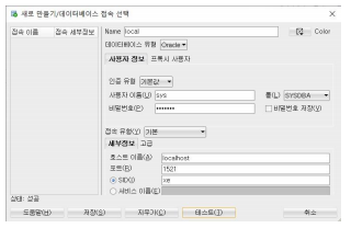 sql developer 접속 테스트를 눌러 좌측 하단의 '상태:성공'이 나온다면 저장을 누르면 된다.