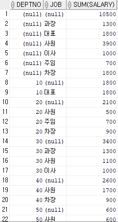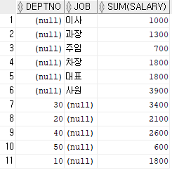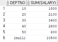 FROM emp GROUP BY ROLLUP(deptno); -- DEPTNO 오름차순으로 정렬 후 해당 항목의 합계를 구함
