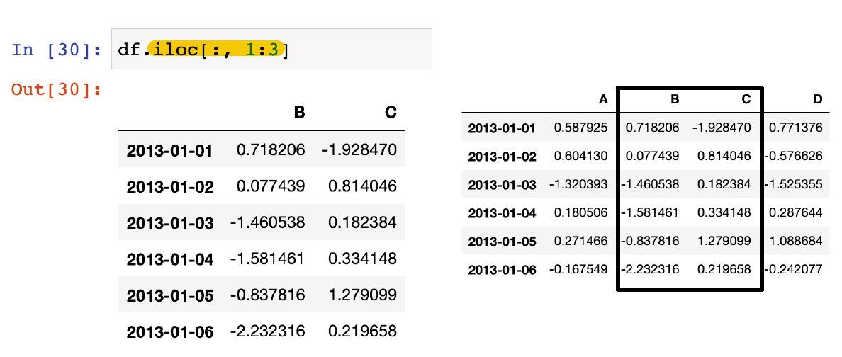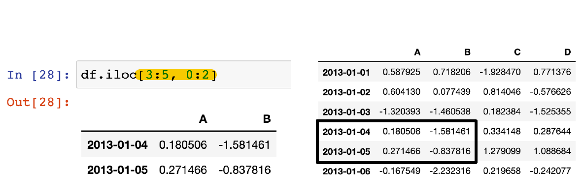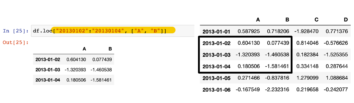 -df[n:m] : n부터 m-1까지, 그러나 index나 column의 이름으로 slice하는 경우는 끝까지 포함