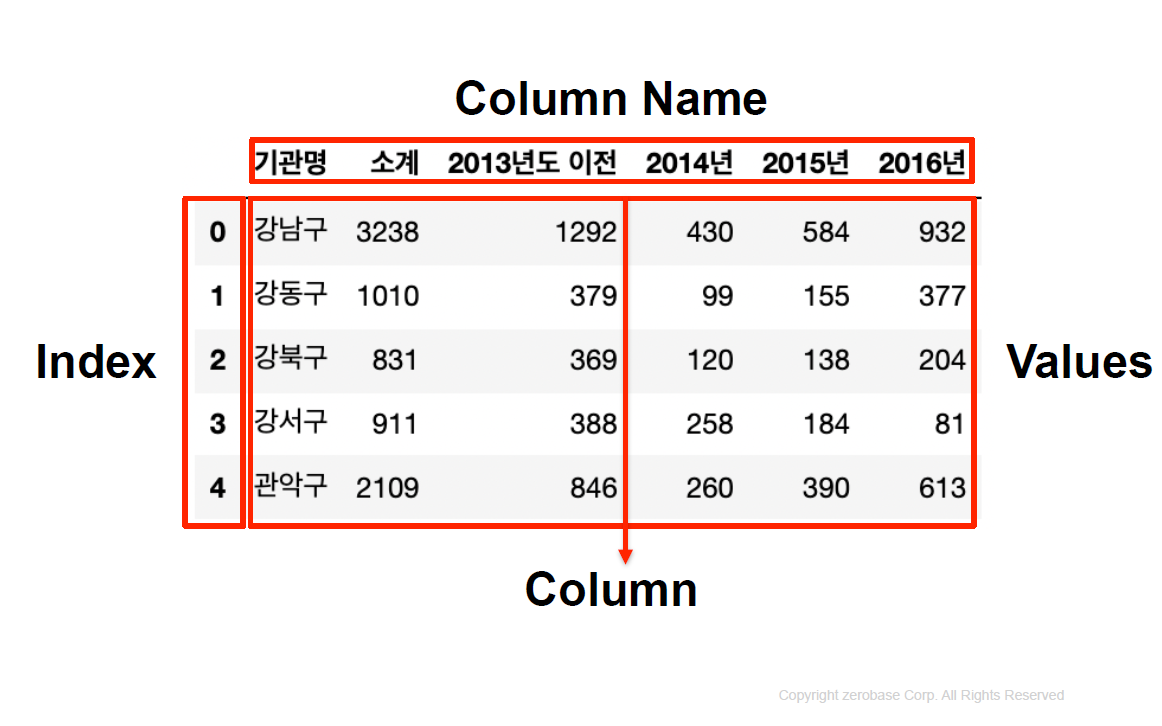 → pandas에서 가장 많이 사용하는 데이터형은 DataFrame이며, index와 columns를 지정하면 됨