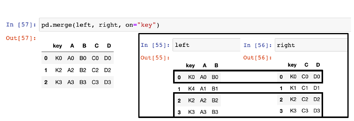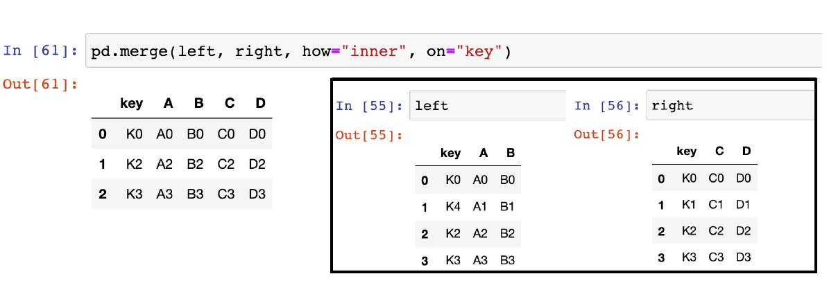 → key column에서 두 데이터 공통분모만 병합(교집합), how를 입력하지 않았을 때의 결과와 동일