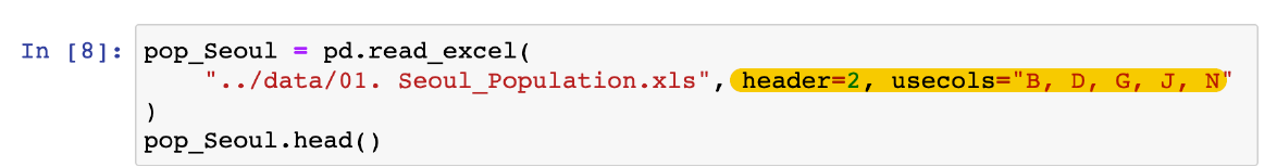 → 엑셀 설정 + 자료를 읽기 시작할 행(header) 지정 + 읽어올 엑셀의 컬럼 지정(usecols)
