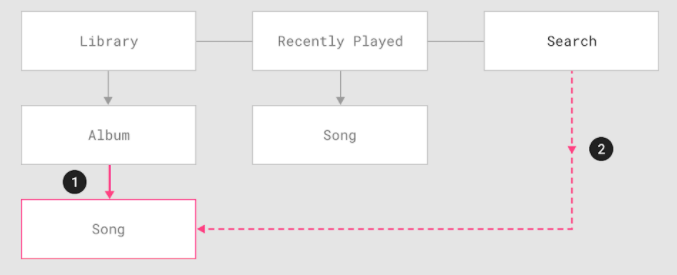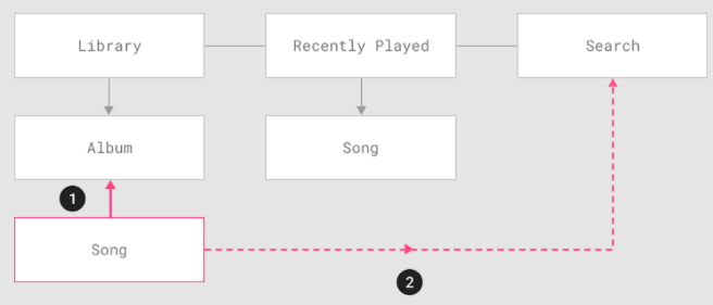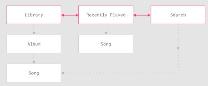 동일한 계층 수준에서 화면 간의 이동을 할 수 있음. 앱의 기본 navigation 요소는 최상위 수준에 있는 모든 대상에 대한 액세스를 제공해야 한다.