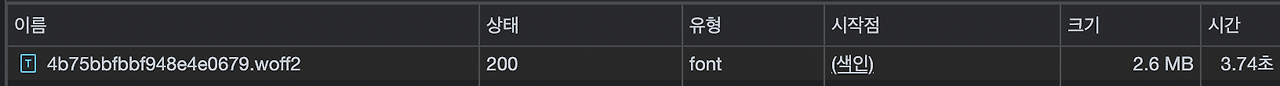 subset을 사용하기 이전의 폰트 파일은 2.6MB로 다운로드 되는데 3.74초가 걸렸다.