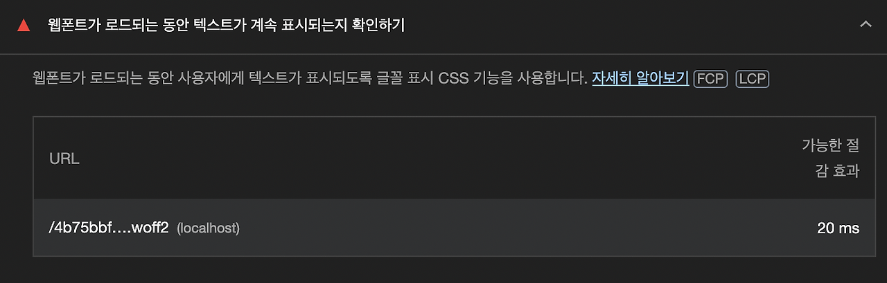 그렇기 때문에 FOIT vs FOUT에 대한 고민이 있었지만, LCP 개선과 사용자에게 스타일이 적용되지 않았더라도 텍스트를 보여주는 것이 낫다고 판단해서 FOUT를 적용했다.