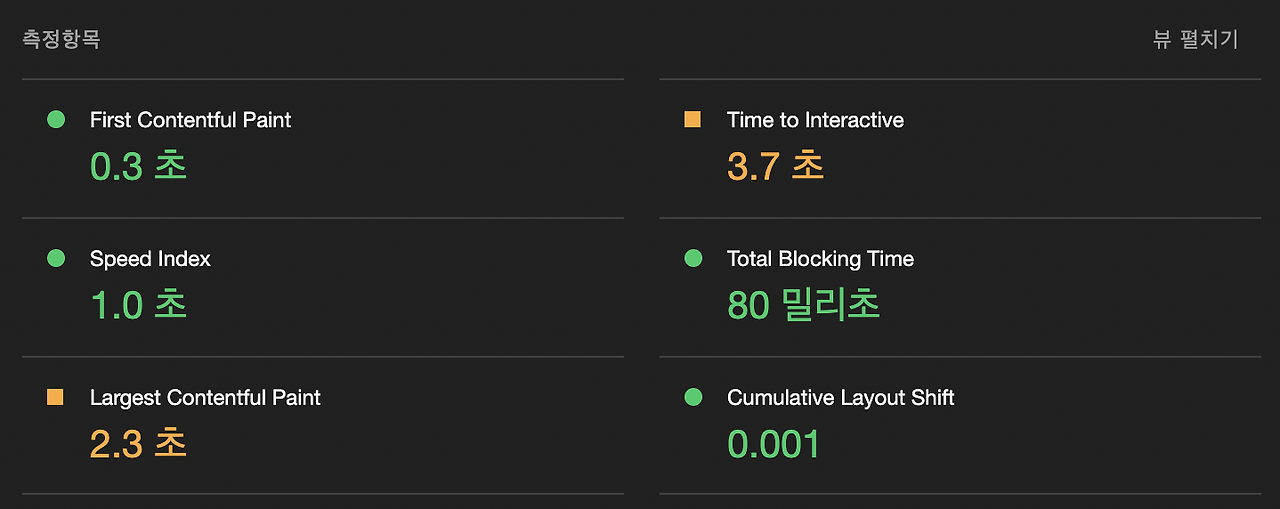 이후에 lighthouse를 측정하니까 아래와 같이 이전보다 성능이 좋아졌다.