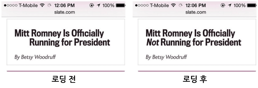 위의 사진은 대표적으로 웹 폰트의 문제점을 보여주는 예시이다. Not을 강조하기 위해 폰트를 적용했지만 폰트가 적용되기 전에는 중요한 의미를 갖는 Not이 보이지 않게 된다. 이는 FOIT와 관련이 있다. FOIT외에도 FOUT가 있는데 이것에 대해서 먼저 알아야겠다.