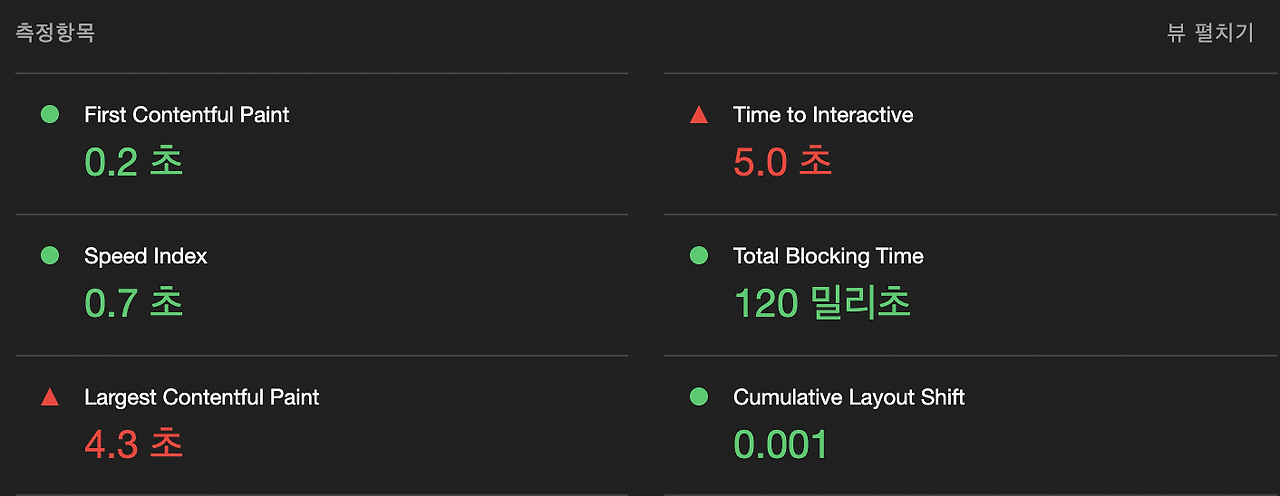 lighthouse로 측정 결과 Time to Interactive와 LCP(Largest Contentful Paint)에서 나쁜 점수를 받았다.