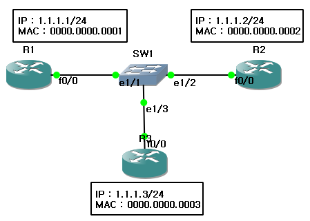 그 후에, 패킷을 Switch로 보낸다. Switch에서는 이 정보를 가지고 MAC Address Table을 생성해서 R1에 대한 IP, MAC 주소를 저장한다. Switch는 패킷을 보고 브로드캐스트 주소를 통해 패킷이 들어온 패킷을 나머지 다른 모든 포트로 보낸다. 그렇게 해서 보내진 패킷은 R2, R3에 도달하게 된다. R2, R3은 패킷의 Destination IP와 기기의 IP 주소를 비교해서 동일하면 반송할 패킷을 구성하고, 아니라면 온 패킷을 버린다. 우리는 1.1.1.3이 Destination IP 이기 때문에 R3이 반송할 패킷을 구성하고, R2는 온 패킷을 버린다.