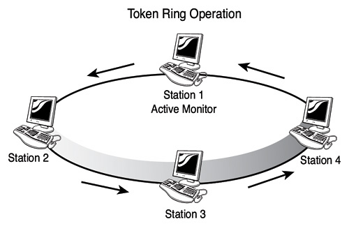 위의 토폴로지에서 보여지는 네트워크 영역에는 하나의 Token이 존재한다. 그 Token을 소유한 Station만 통신을 할 수 있다. 이 Token은 한 방향으로 돌면서 모든 Station이 통신할 수 있도록 한다.