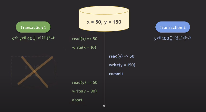 트랜잭션1은 X에서 40을 빼고 y에 더하는 작업을 한다.