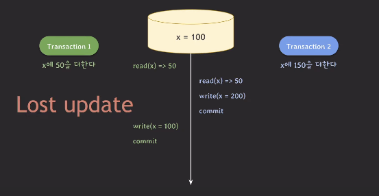 만일, 트랜잭션1과 2가 순차적(serial)으로 실행되었다면, x의 값은 250이 되었을 것이다.