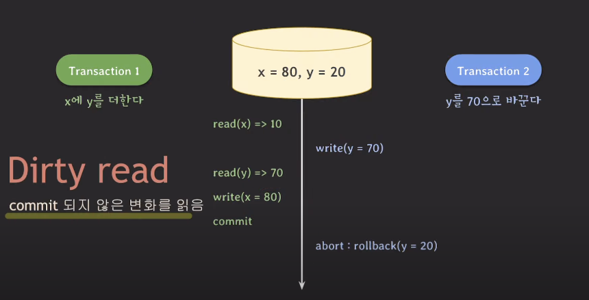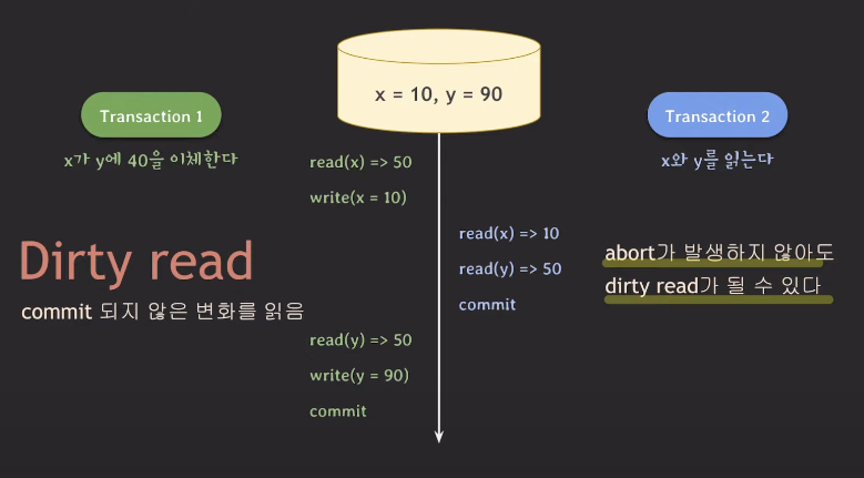 즉, 커밋되지 않은 x와 y의 값을 읽었기 때문에 최종 결과와 다른 데이터를 읽게 된 것이다.