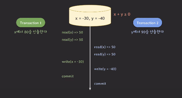 - 조건을 만족했기 때문에, 트랜잭션1이 x에서 80을 뺀다. x의 값은 -30이 된다.
