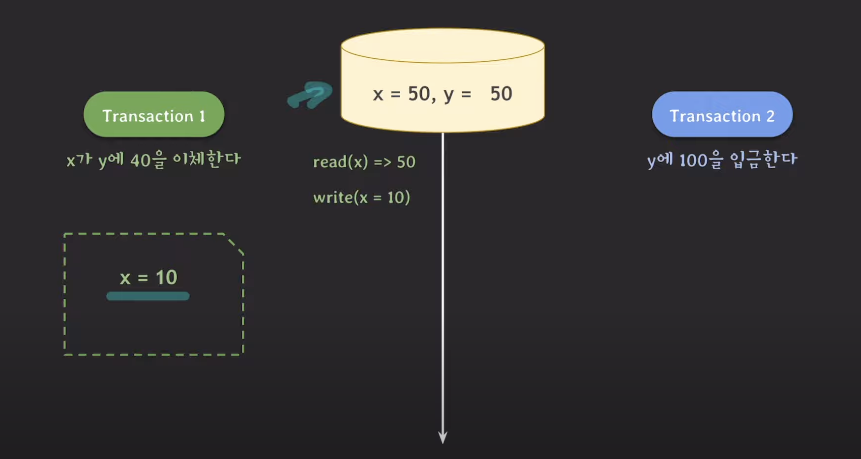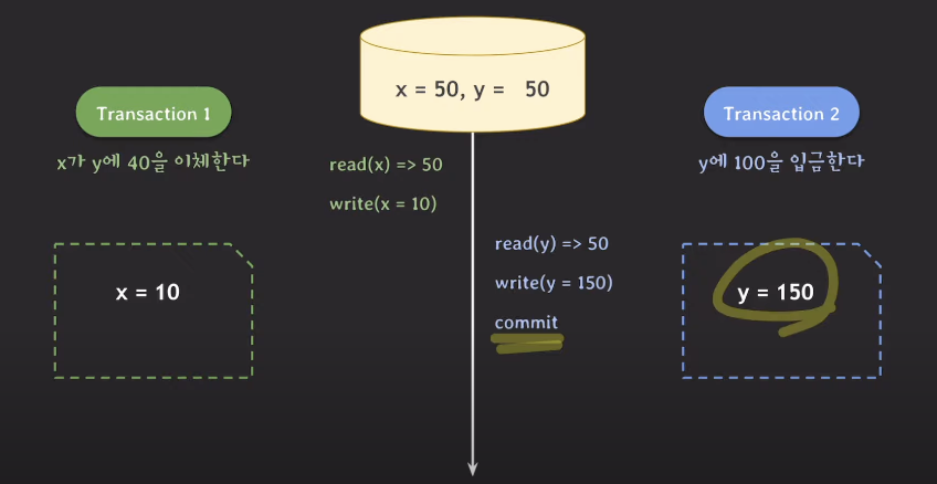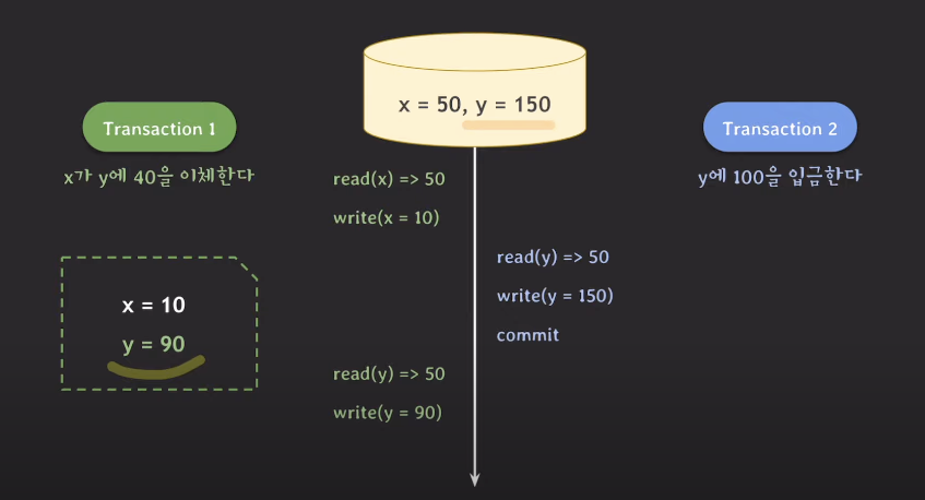 이때 x의 값은 10, y의 값은 50이 조회된다.- 트랜잭션1은 y의 값을 읽고 40을 더한다.