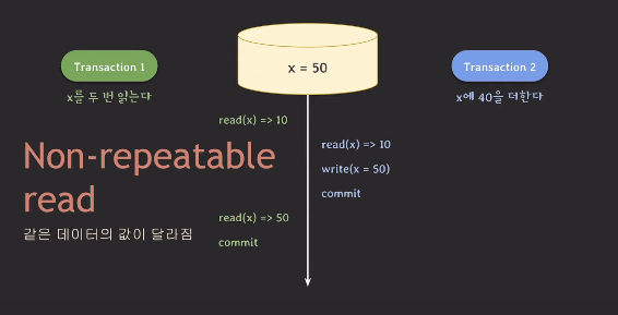 하지만, 트랜잭션1에서 읽어온 x의 값은 서로 다르다.
