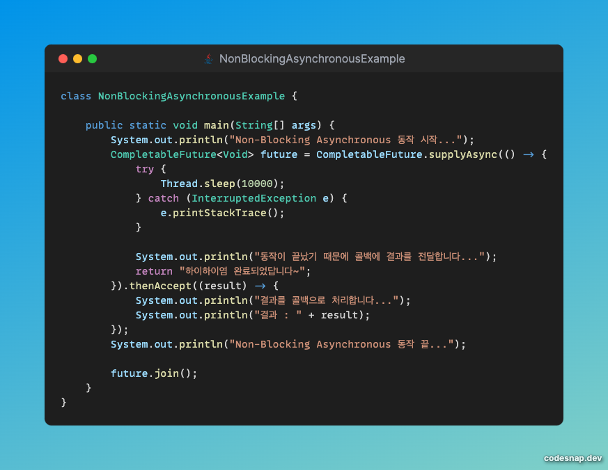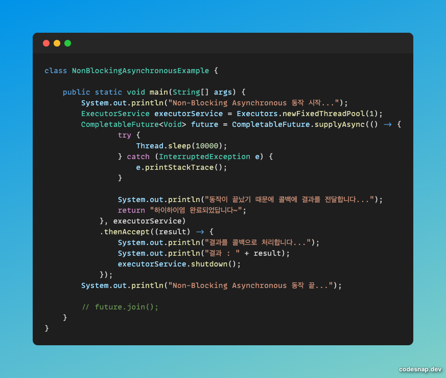 그렇기 때문에future.join()을 호출하지 않으면 작업이 완료되기 전에 메인 스레드와 함께 종료된다.