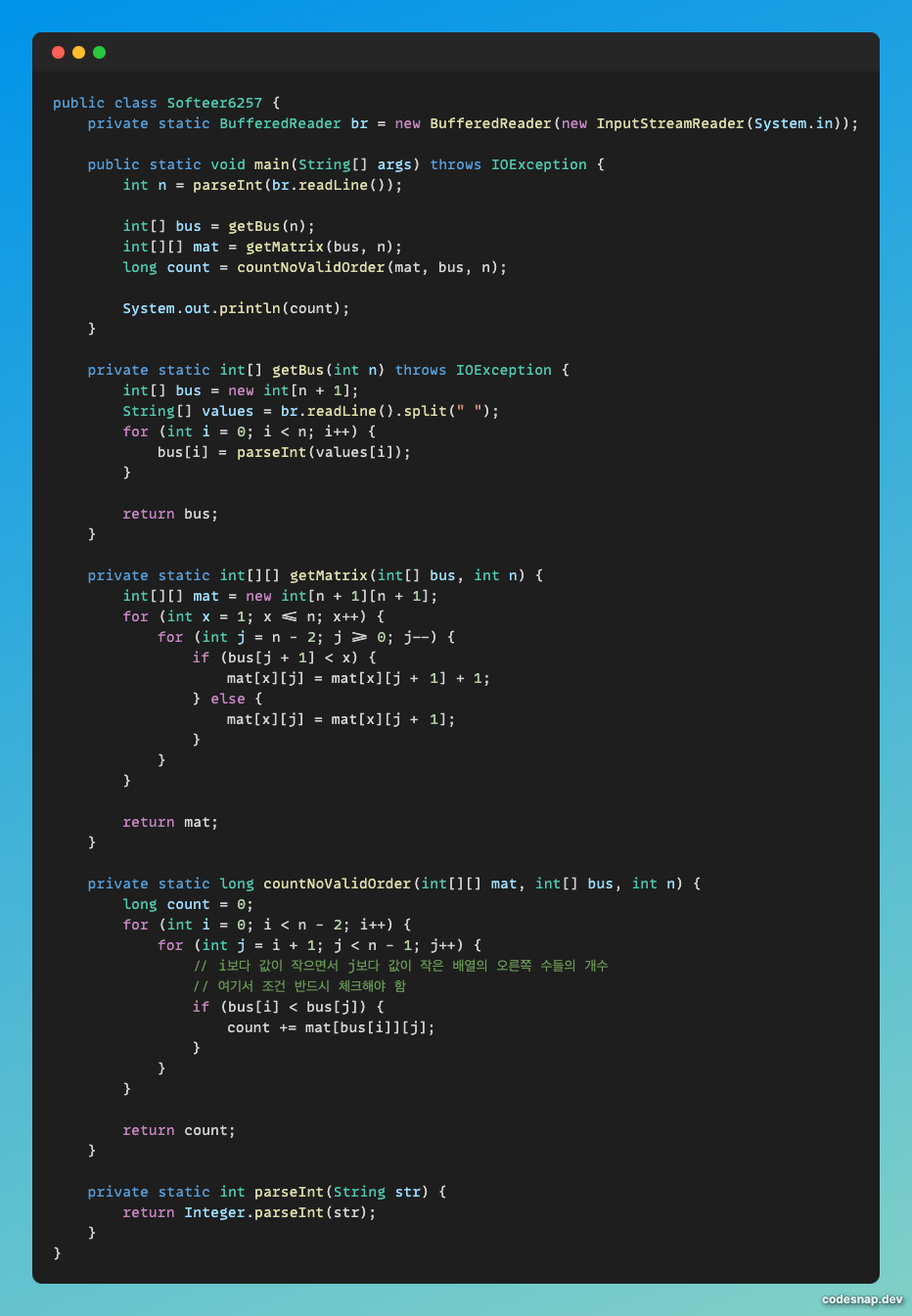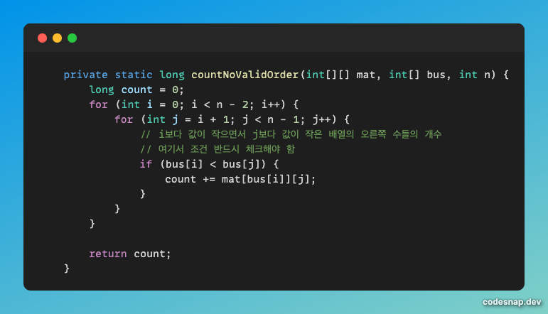 그리고 안쪽에 if (bus[i] < bus[j])에서 2) ai < aj 조건을 만족시키고 있다.
