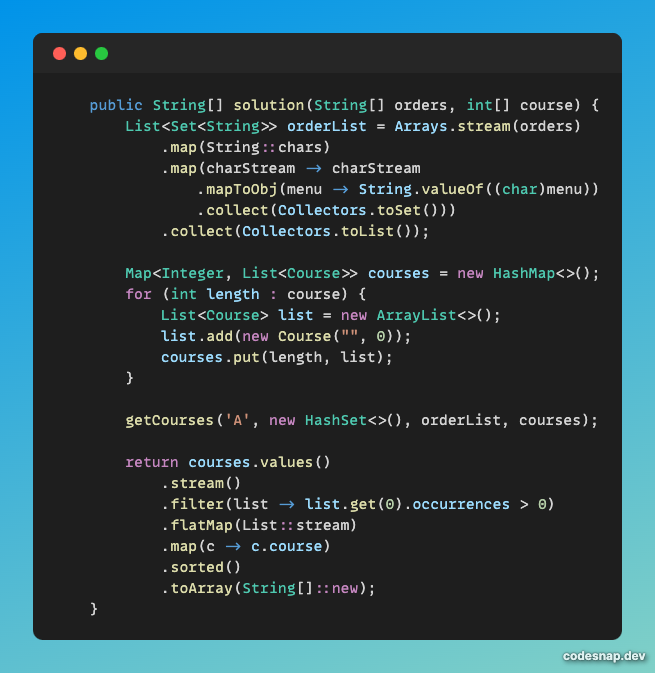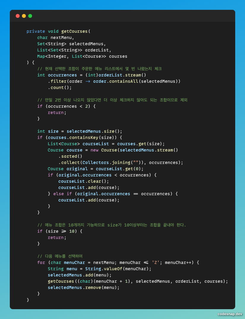 이제 조합으로 답의 후보가 되는 코스를 찾는 getCourses 메서드이다.