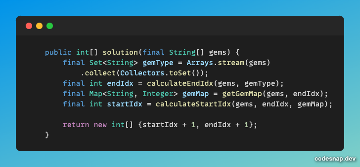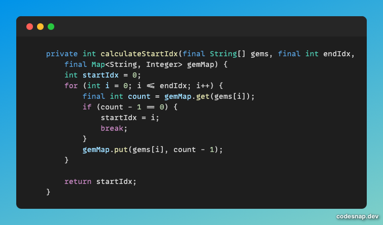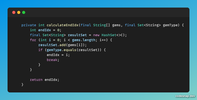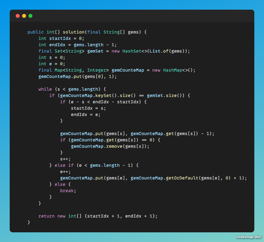 2. gems 배열과 gemType 집합을 가지고 endIdx의 값을 구한다.