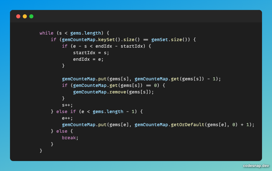 s가 gems 배열의 끝에 도달하기 전까지 반복을 한다.