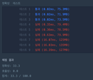 하지만 예제 케이스 3개(테스트1, 2, 3)를 제외한 나머지 케이스는 실패했다.