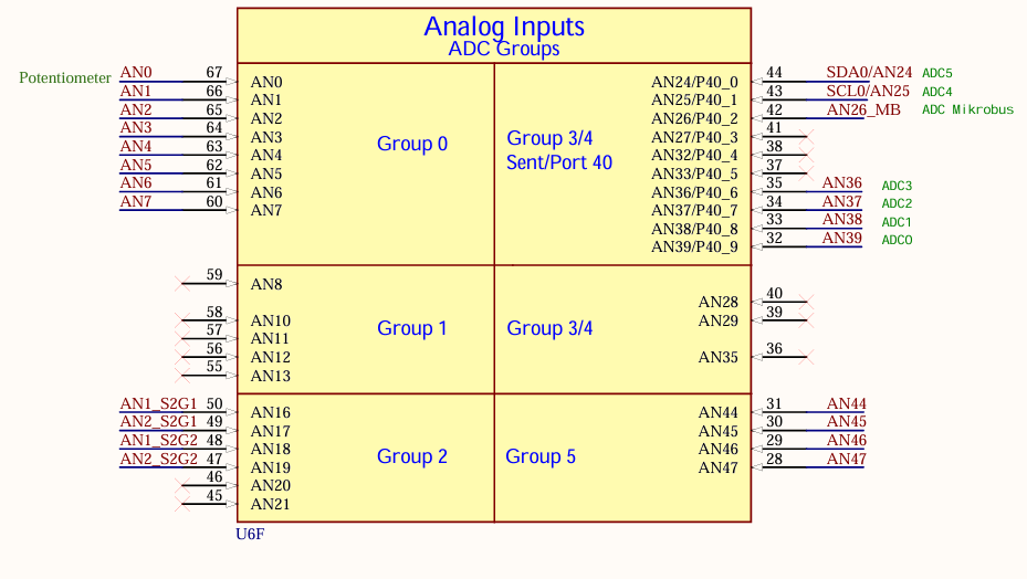 67번 Pin에 첫번째 아날로그 입력라인 AN0가 있는데 이것은 0번째 Group (Converter)의 0번째 채널