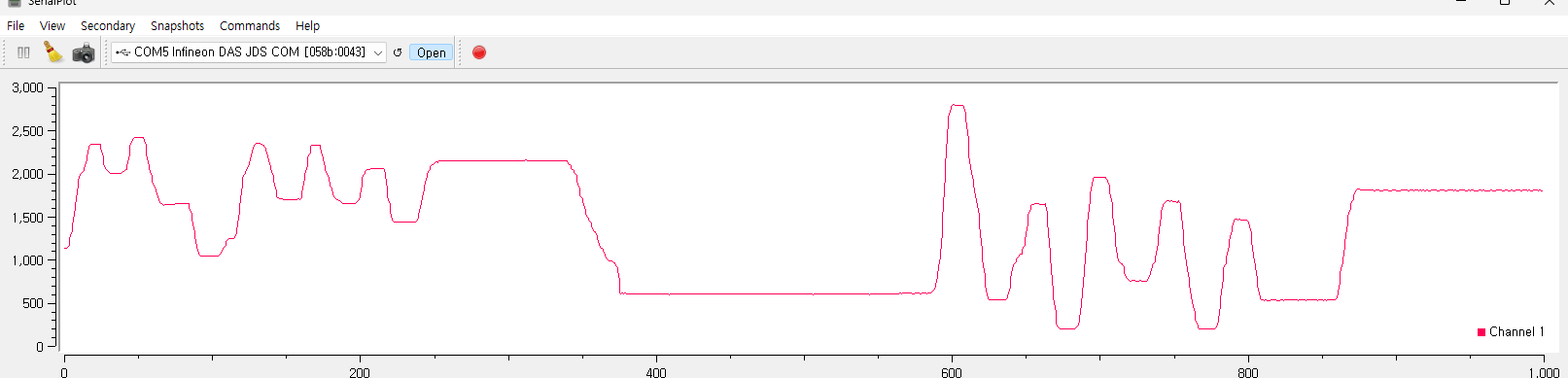 Potentialmeter를 돌렸을때 바뀐 ADC Conversion 값이 정상적으로 Plotting 되는것을 확인할 수 있었다.
