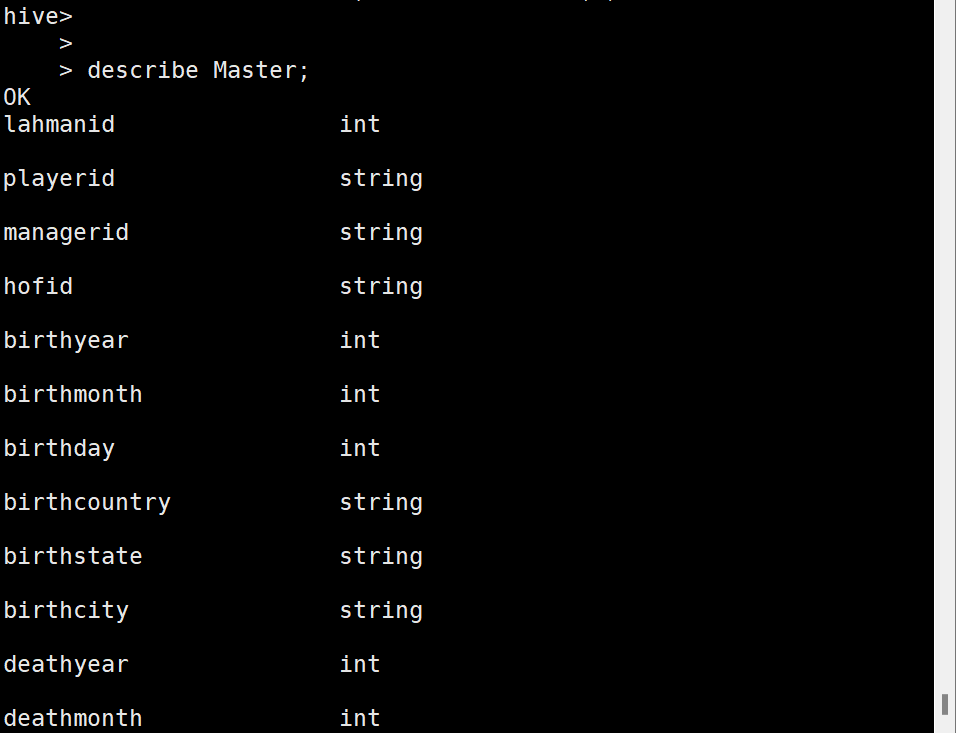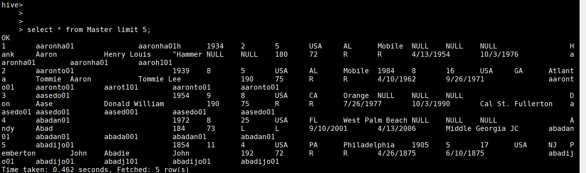 LOAD DATA INPATH '/hive/baseball/input/Master.csv' OVERWRITE INTO TABLE Master;