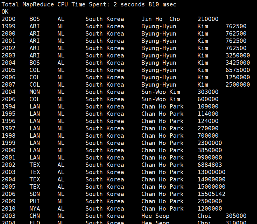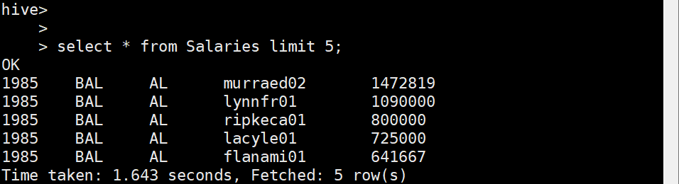 LOAD DATA INPATH '/hive/baseball/input/Salaries.csv' OVERWRITE INTO TABLE Salaries;