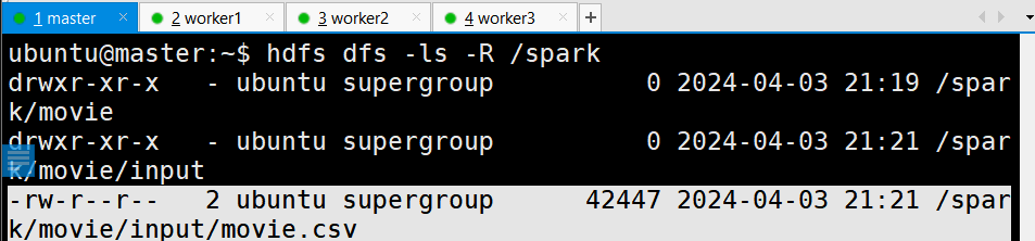 hdfs dfs -put /home/ubuntu/data/movie.csv /spark/movie/input/