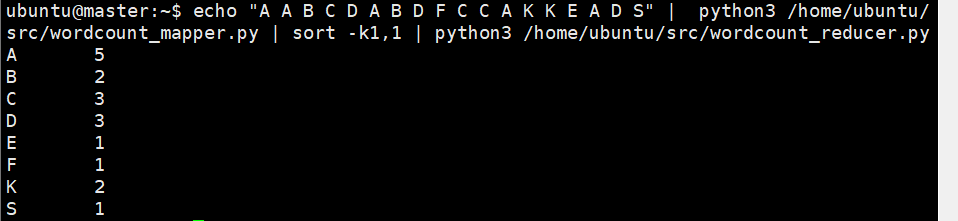 echo "A A B C D A B D F C C A K K E A D S" | python3 /home/ubuntu/src/wordcount_mapper.py | sort -k1,1 | python3 /home/ubuntu/src/wordcount_reducer.p