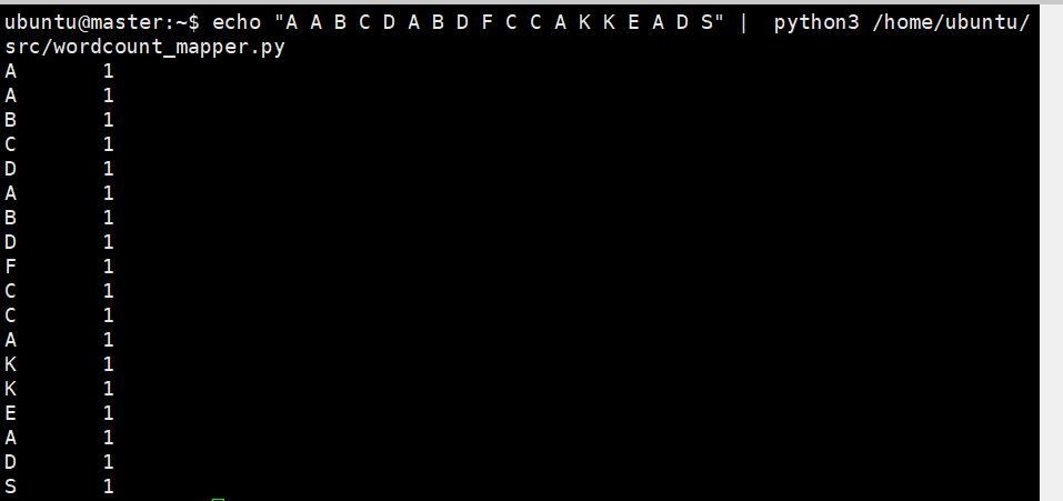 echo "A A B C D A B D F C C A K K E A D S" | python3 /home/ubuntu/src/wordcount_mapper.py