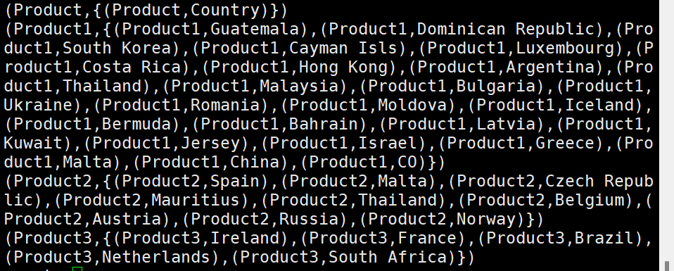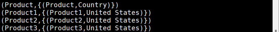 GroupByCountryMin = FOREACH (GROUP (DISTINCT CountryMinByProduct) BY Product)
