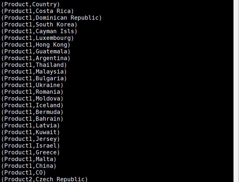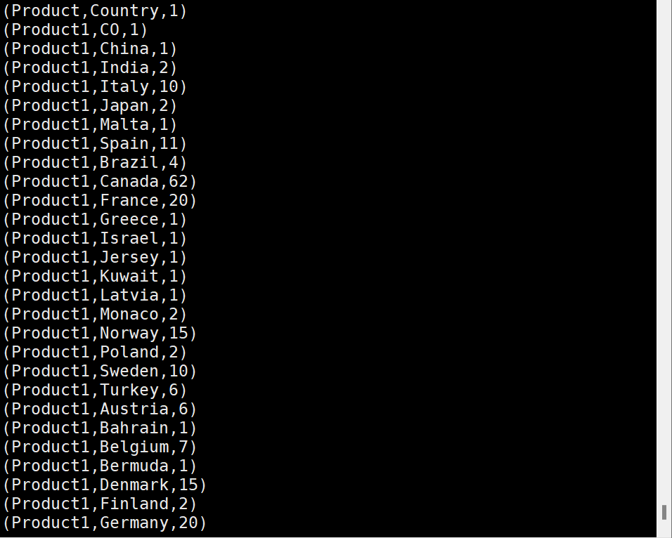 GENERATE (chararray)group.Product, (chararray)group.Country, COUNT(salesTable) as CNT;