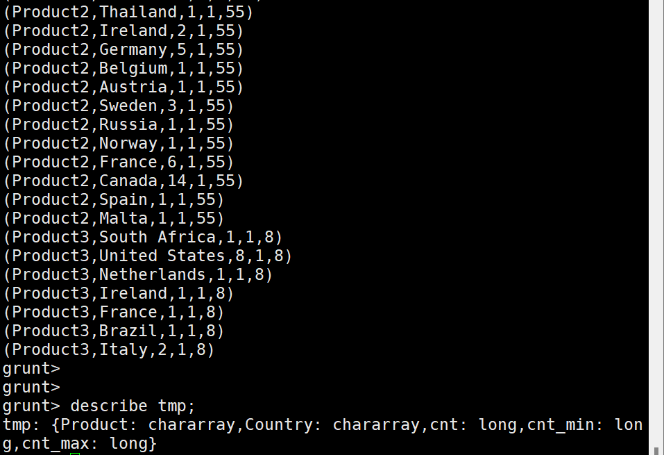 CountryMinByProduct = FOREACH (FILTER tmp By cnt == cnt_min)