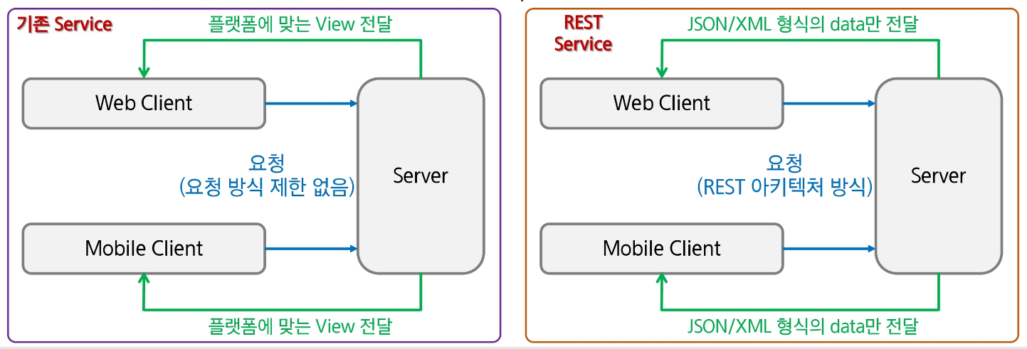 - ์์ฒญ์ ๋ํ ์ฒ๋ฆฌ๋ฅผ ํ ํ ๊ฐ๊ณต๋ data๋ฅผ ์ด์ฉํ์ฌ ํน์ ํ๋ซํผ์ ์ ํฉํ ํํ์ View๋ก ๋ง๋ค์ด์ ๋ฐํ