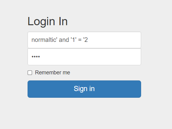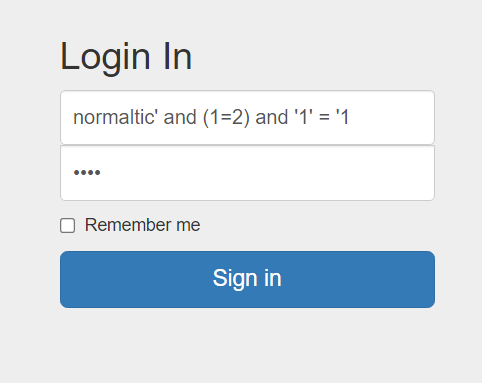 | normaltic' and (1=2) and '1' = '1 | Result(False) |